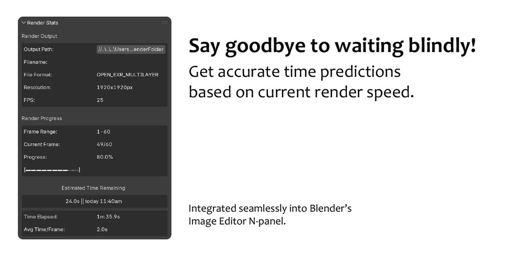 Get real-time progress updates, estimated time remaining, and performance insights — right inside Blender’s Image Editor.